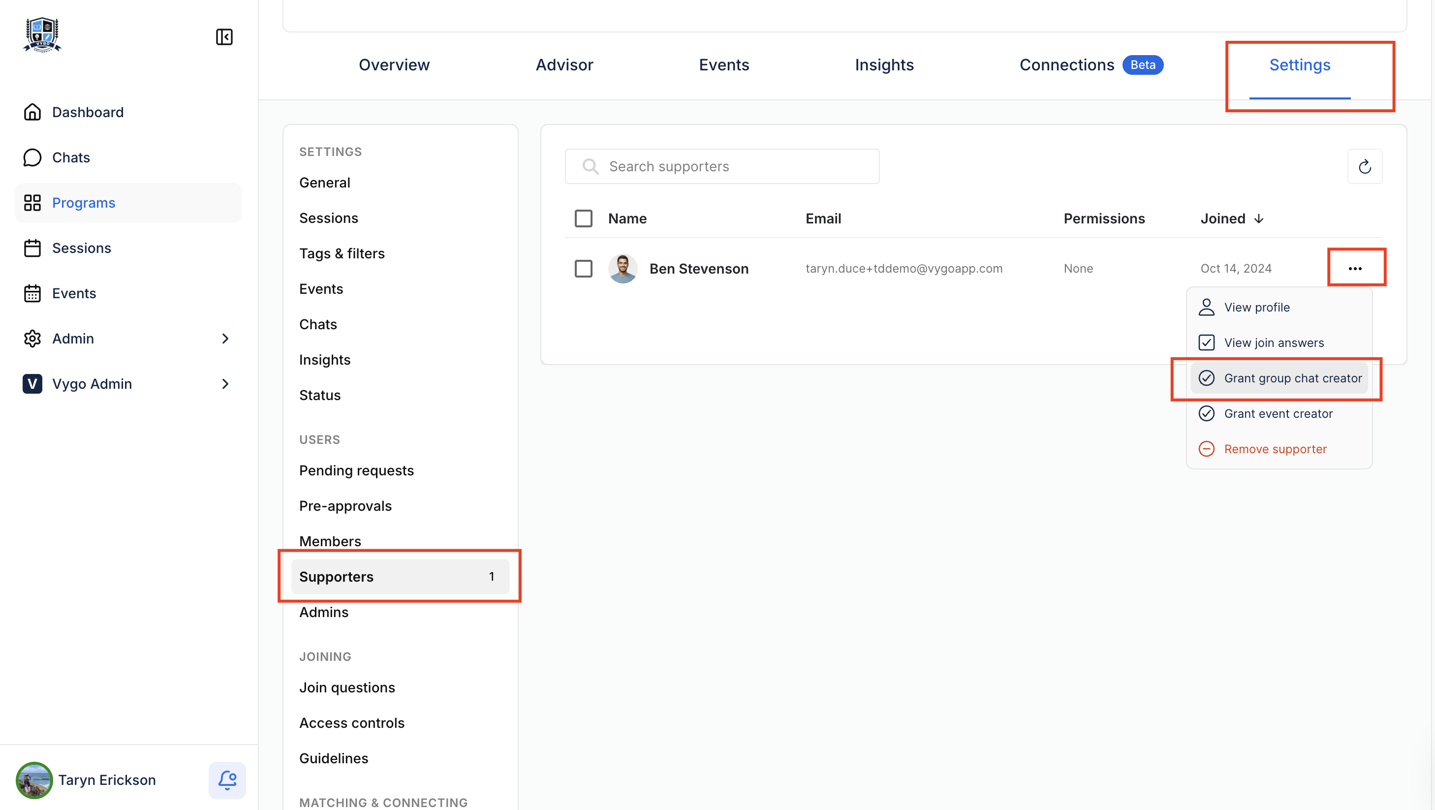 - Select the three dots next to the Supporter you want to give group chat creation permission to