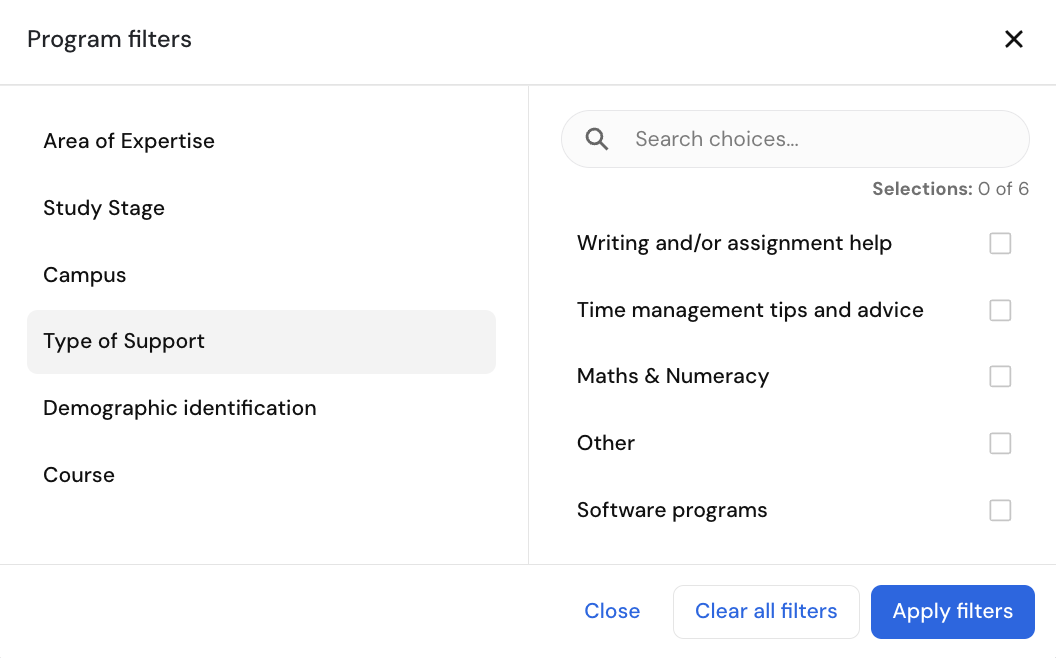 - Select Filters: Users can filter programs by selecting tags from different groups and refining their search to find the most relevant programs.