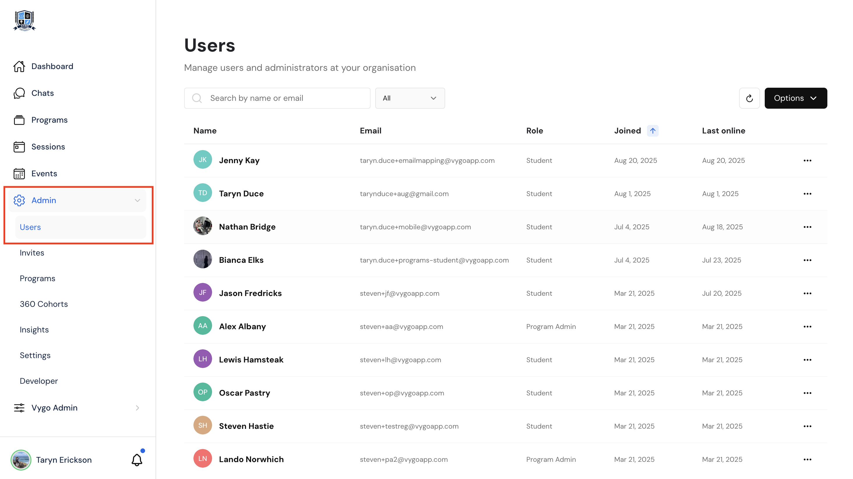 To manage user roles at the organisational level, you must have Organisational Administrator access. If you are a Program Administrator, you can only manage users within your specific program settings.