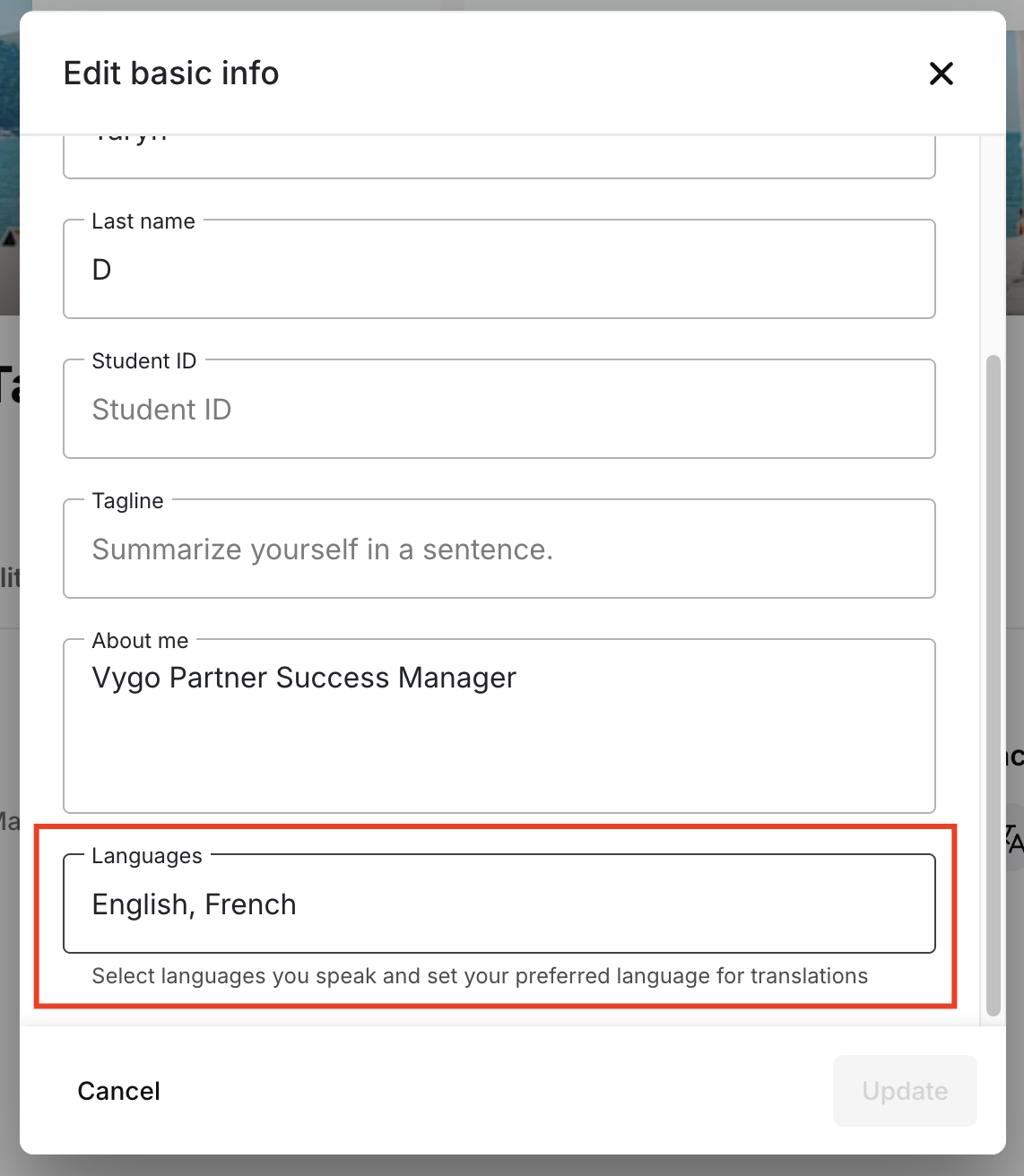- Setting it here will enable in-chat translation from the start of your Vygo experience.