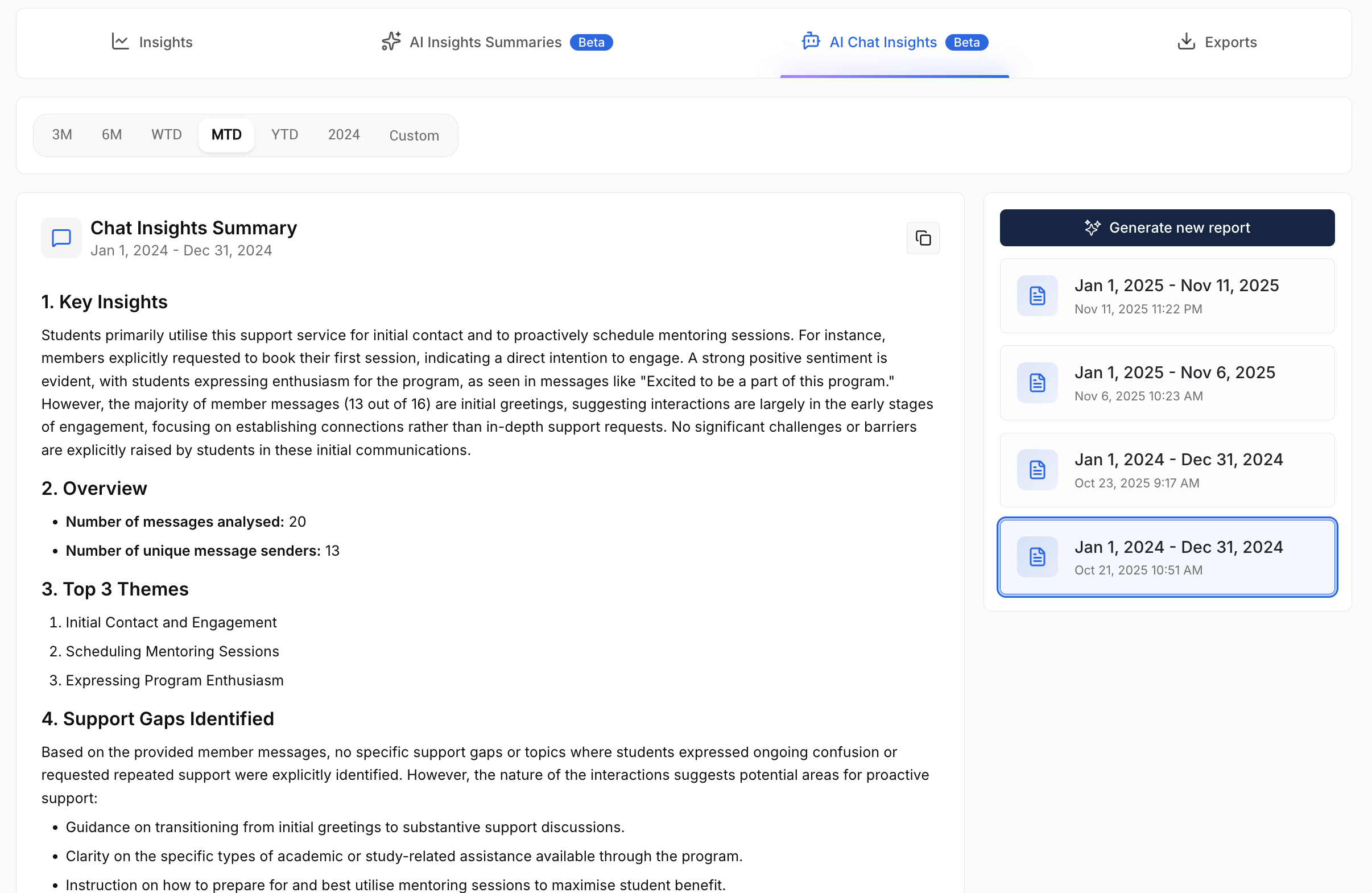 All previously generated AI Chat Insights reports can be revisited by navigating to the same section and selecting the desired date range.